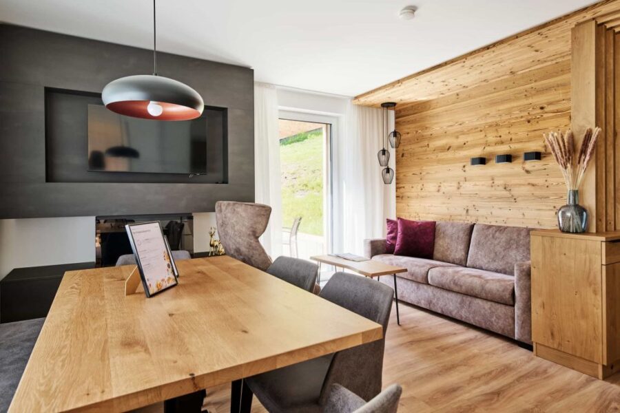 Buiten ruisen de dennen, glinsteren de zon en schittert de Damülser bergwereld in het zonlicht. Binnen? Daar wacht dezelfde magie. Warme houttinten, natuurlijke materialen en een interieur dat voelt als een knusse omhelzing. In Alpenstolz Damüls kom je tot rust na een heerlijke dag buiten in de sneeuw.