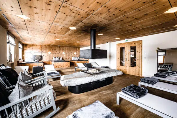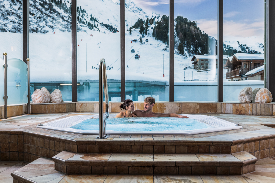 De Gletscher Spa beslaat 1.200 m² pure rust. Het warme water van de whirlpool, het zachte licht en de gedempte kleuren zorgen voor een sfeer die meteen ontspant.