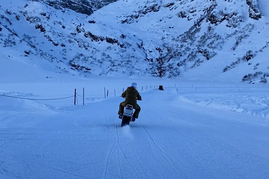 Onder aan de gondel ligt het Snowxpark, waar je met een sneeuwscooter kan rijden. Het moonbiken in het snowXpark is moeilijker dan het er uit ziet. Maar na een paar rondjes heb ik hem door en kan ik het gas steeds harder indrukken.  Dit is wel heel erg leuk.