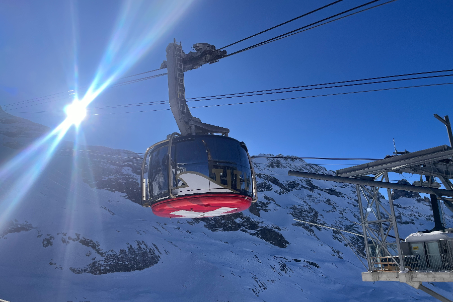 De Titlis Rotair-gondel is alleen al een attractie op zich zelf. Deze grote, rode gondel is de eerste lift ter wereld die 360 graden ronddraait tijdens de tocht omhoog. Ik kan overal in de lift gaan staan en tijdens de rit omhoog is het uitschrift onbeschrijflijk mooi.