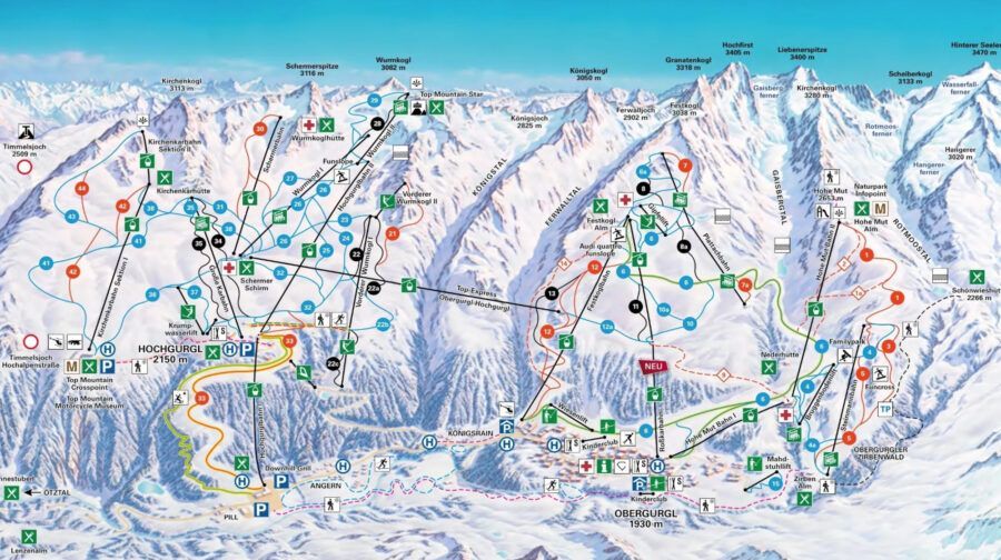 Skigebied Gurgl bestaat eigenlijk uit twee delen: Hochgurgl en Obergurgl. Deze twee gebieden zijn met elkaar verbonden met de ‘Top-Express’ een horizontale gondel. De lift duurt zo’n 10 minuten en onderweg heb je een fantastisch uitzicht op de vele 3.000-ers die in dit deel van de Alpen te zien zijn.