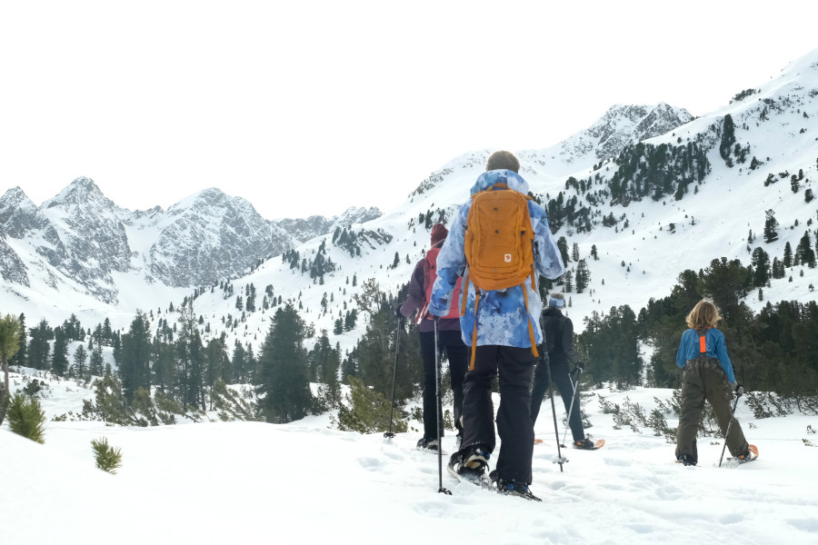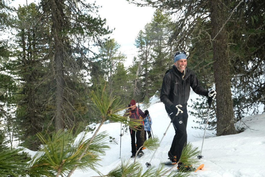 Wanneer na een lange ochtend onze benen wat zwaarder worden, is het tijd om de skischoenen weer uit te trekken, er staat nog een andere winteractiviteit op het programma. We gaan namelijk sneeuwschoenwandelen.