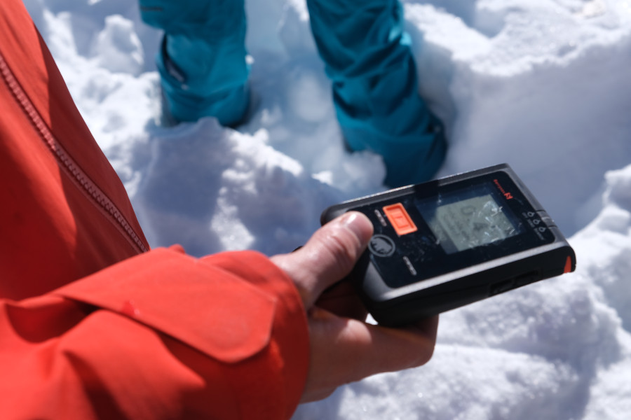 De belangrijkste les die we leren, is de omgang met de lawinepieper, schep en sonde. Dit is de ‘heilige’ drie-eenheid. Het hoogstnoodzakelijke dat je nodig hebt om iemand die bedolven wordt onder een lawine weer terug te vinden. Dat werkt ongeveer als volgt: